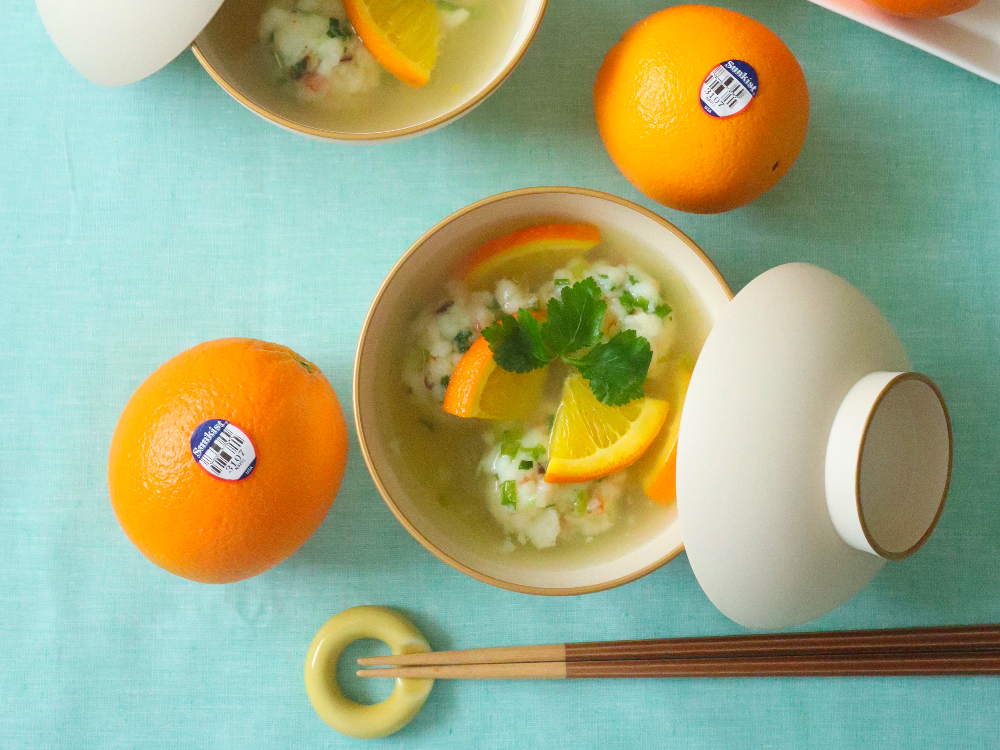 - 4の鍋に、1のカリフォルニア産のサンキストネーブルオレンジのいちょう切りと果汁を加え、火を止める。【B】を小鉢に入れ混ぜ合わせてから回し加え、 弱火で加熱し優しくかき混ぜとろみが付いたら火を止める