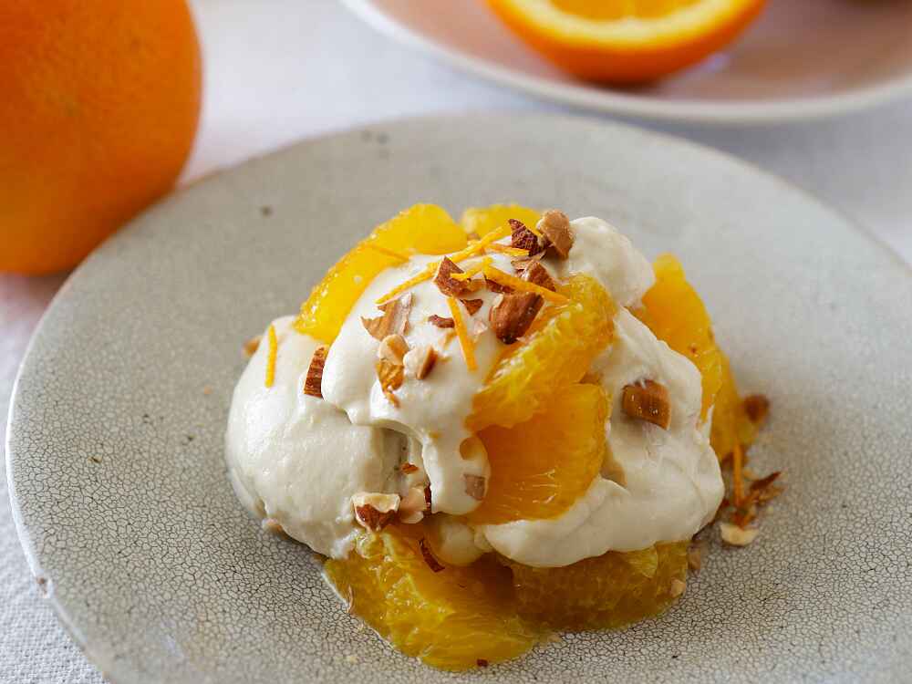 - 皿にサンキスト®オレンジを少量盛り、上から3をかけ、アーモンドを少量のせます。何回か繰り返し交互に高く盛りつけます。最後に3をのせたらアーモンド、細切りにしたサンキスト®オレンジの皮をのせます。